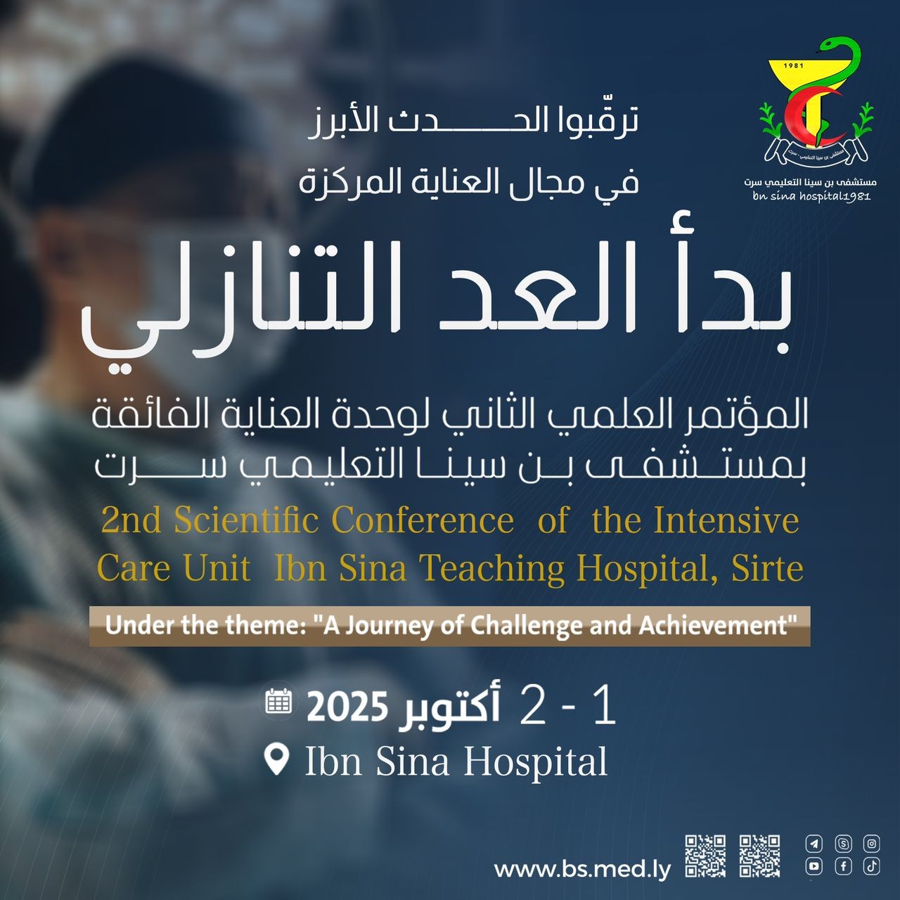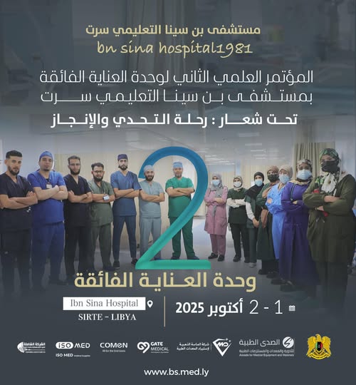 أختتمت ظهر اليوم بقاعة الدكتور عبدالقادر العماري بمستشفى بن سينا التعليمي بسرت فعاليات المؤتمر الثاني لوحدة العناية الفائقة الذي نظمه قسم العناية الفائقة بالمستشفى تحت شعار "رحلة التحدي والإنجاز" بدعم مباشر من القيادة العامة للقوات المسلحة والجهاز الوطني للتنمية وبرعاية عدد من الشركات الطبية المساهمة .
