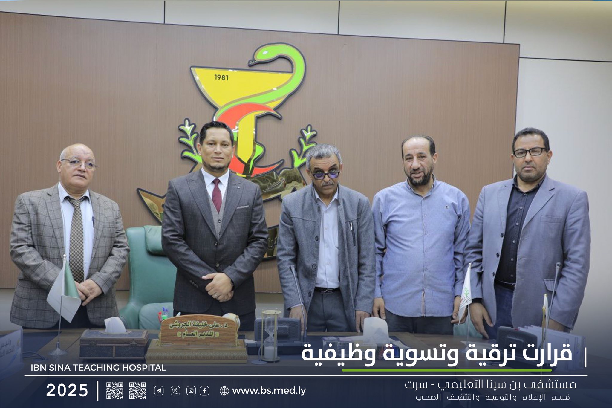 بناءً على التوصيات الهامة الصادرة عن لجنة شؤون الموظفين بالمستشفى عُقد اليوم في مكتب المدير العام الدكتور علي خليفه الجروشي اجتماعاً موسعاً خصص لتوقيع قرارات الترقية والتسوية الوظيفية الشاملة التي ستطال جميع الموظفين في مستشفى بن سينا التعليمي سرت .الاجتماع الأول لسنة ( 2025 ) تناول ثلاثة بنود رئيسية قسمت على النحو التالي :-